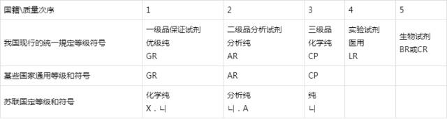 化學試劑在生產時,按用途不同制造出等級不同的規格,以供各使用單位按實驗要求選用。